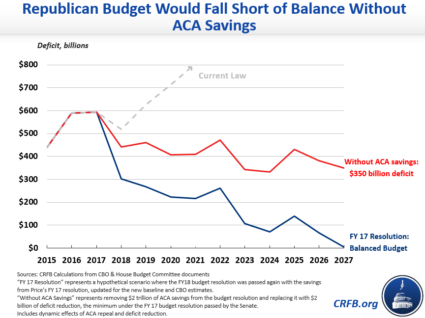 Adopting the same savings from last year's proposed budget would be sufficient to reach balance by 2027. Yet if ACA repeal and replace saved only $2 billion instead of $2 trillion, the budget would leave a $350 billion deficit at the end of the decade.